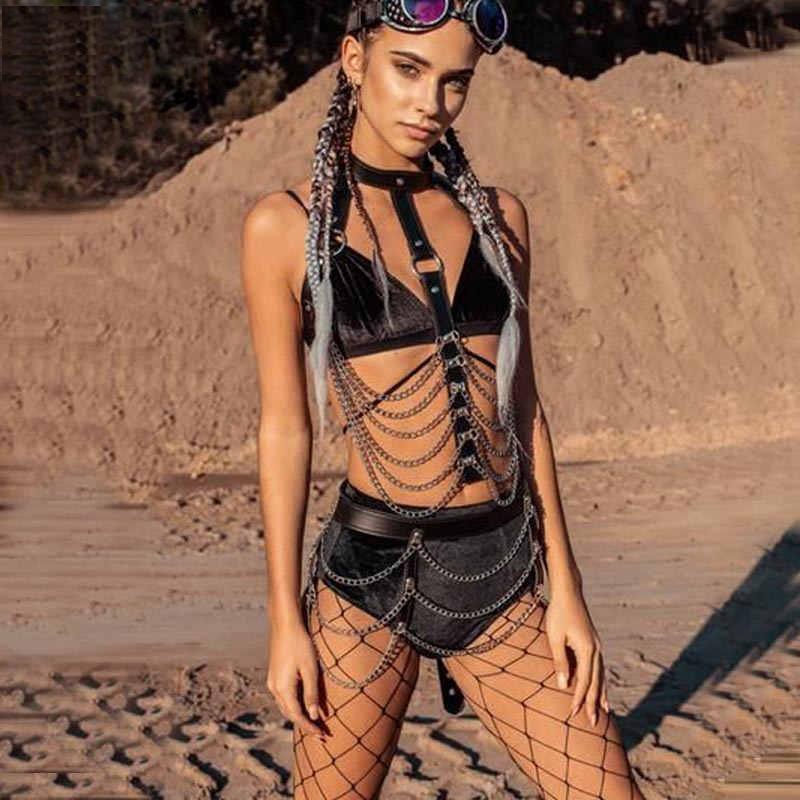 Leather Harness Set 2Pcs Sexy Punk Leather Body Bondage Stud Garters Belt With Chains Chest Harness And Skirt Women Bandage Harness Waist Belt